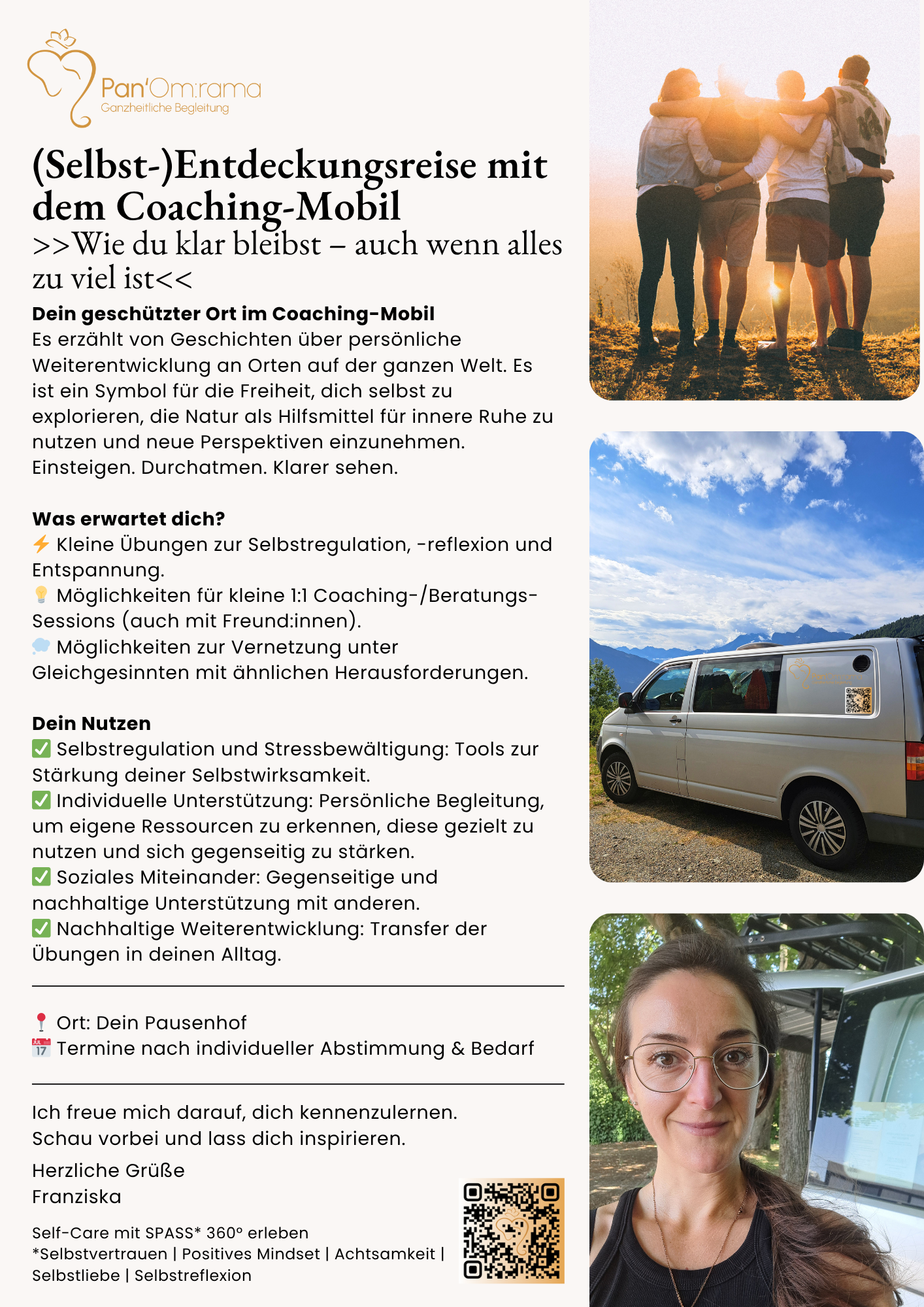 Mit dem Coaching-Mobil connecten wir junge Menschen miteinander und schaffen ein Bewusstsein für Persönlichkeitsentwicklung in jungen Jahren über Ländergrenzen hinweg. Junge Menschen erleben „Self-Care Adventure“ in der Natur.